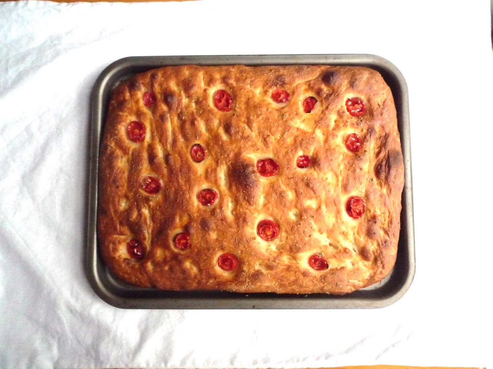 Quando l'impasto è lievitato versarlo su una teglia unta abbondantemente con olio. Con le dita formare delle buchette sulla superficie della focaccia, appoggiare qualche fettina di pomodoro e versare anche tutto il condimento dei pomodori, emulsionato, sulla superficie della focaccia, aggiungere un po' d'olio se necessario. Spargere qualche granello di sale grosso e il rosmarino se piace. Lasciar riposare un'altra ora. Infornare in forno caldo al massimo ( 230°C) per 25 minuti circa.